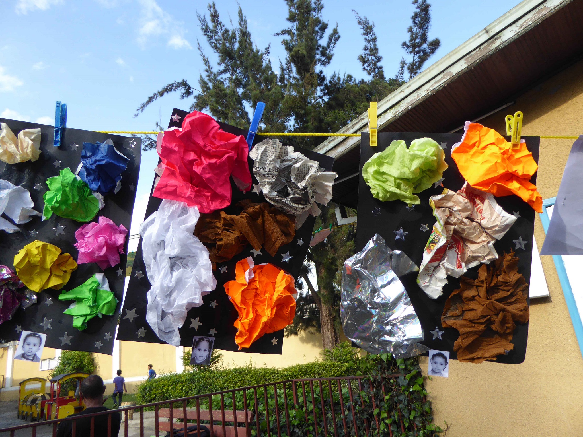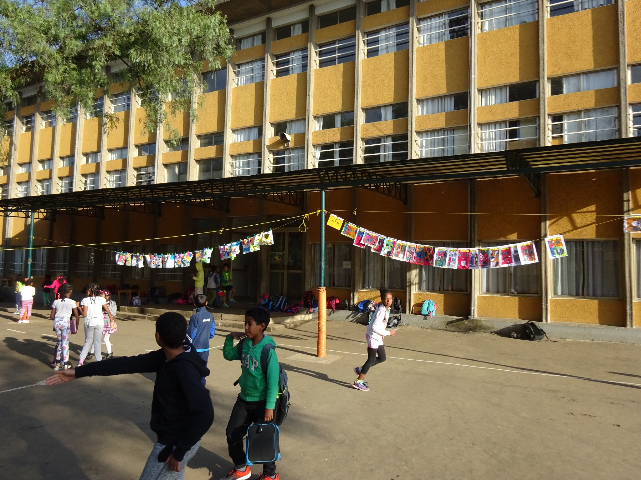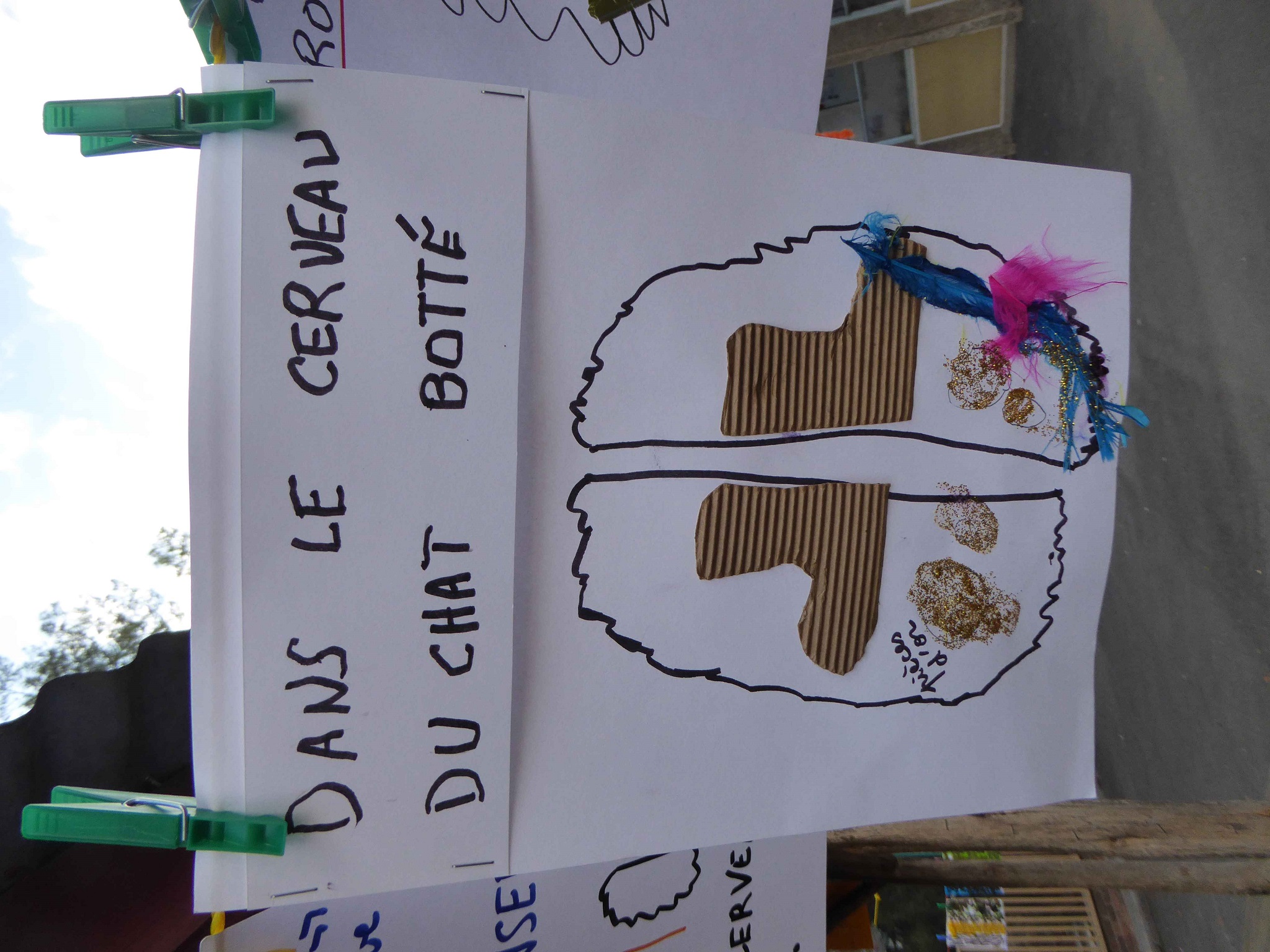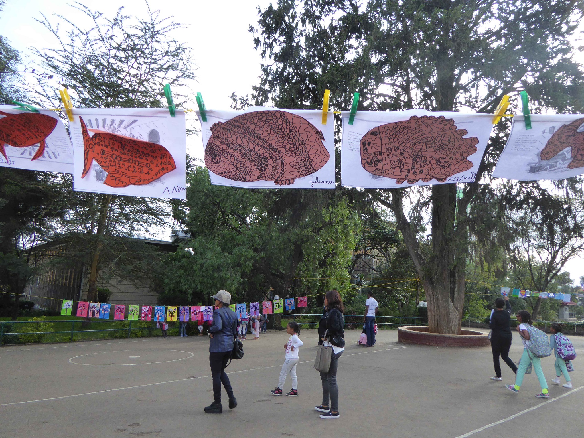 Au lycée Guébré Mariam, à Addis Abeba, de la maternelle au cycle 3, pas moins de 600 élèves ont participé à cette installation éphémère. Le thème de cette édition était « matière(s) à penser » . Ce sont 600 œuvres étendues sur le fil à linge accroché pour l’occasion dans les deux cours de l’établissement. Grâce à cette exposition géante, nous savons enfin « quelles matières utiliser pour représenter la pensée ? » et surtout ce qu’il y a « dans le cerveau du chat botté » !