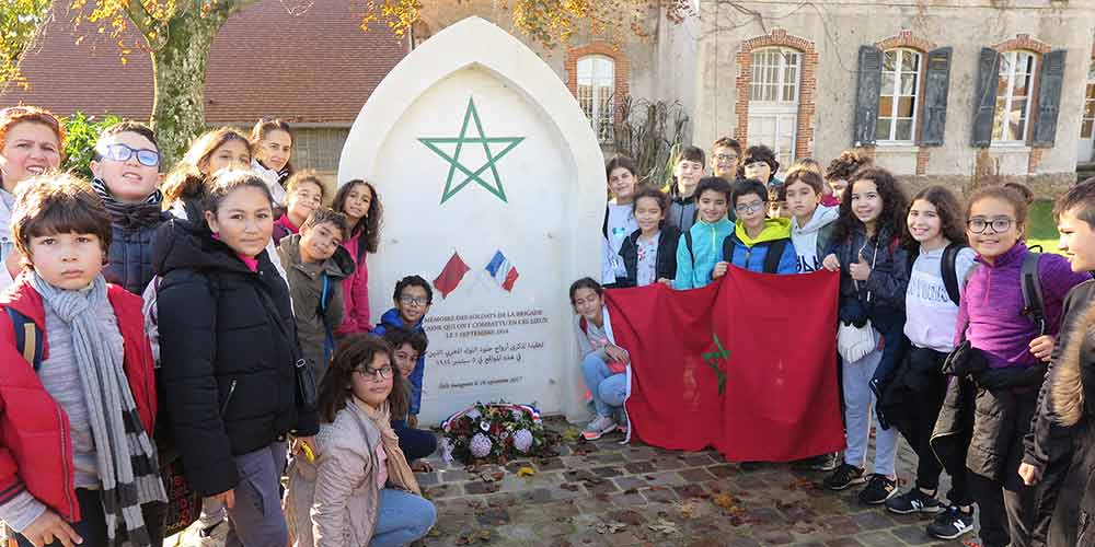 A Chauconin-Neufmontiers et à Villeroy (Seine-et-Marne), ils ont observé la stèle commémorative de l’engagement des troupes de la Brigade Marocaine et ont parcouru, à l’occasion d’une randonnée de quelques kilomètres, le champ de bataille. C’était le samedi 5 septembre 1914, lors de la première Bataille de la Marne. Pour son premier combat, au prix de nombreuses victimes (1169 hommes blessés ou tués sur les 1800 soldats), la Brigade Marocaine a contribué à briser l’avance allemande à seulement une trentaine de kilomètres de Paris. Le repli des troupes marocaines put se faire notamment par l’appui et le sacrifice de la 19e Compagnie du 276e Régiment d’Infanterie de Réserve du Lieutenant Charles Péguy, qui périt le même jour, une balle en plein front !