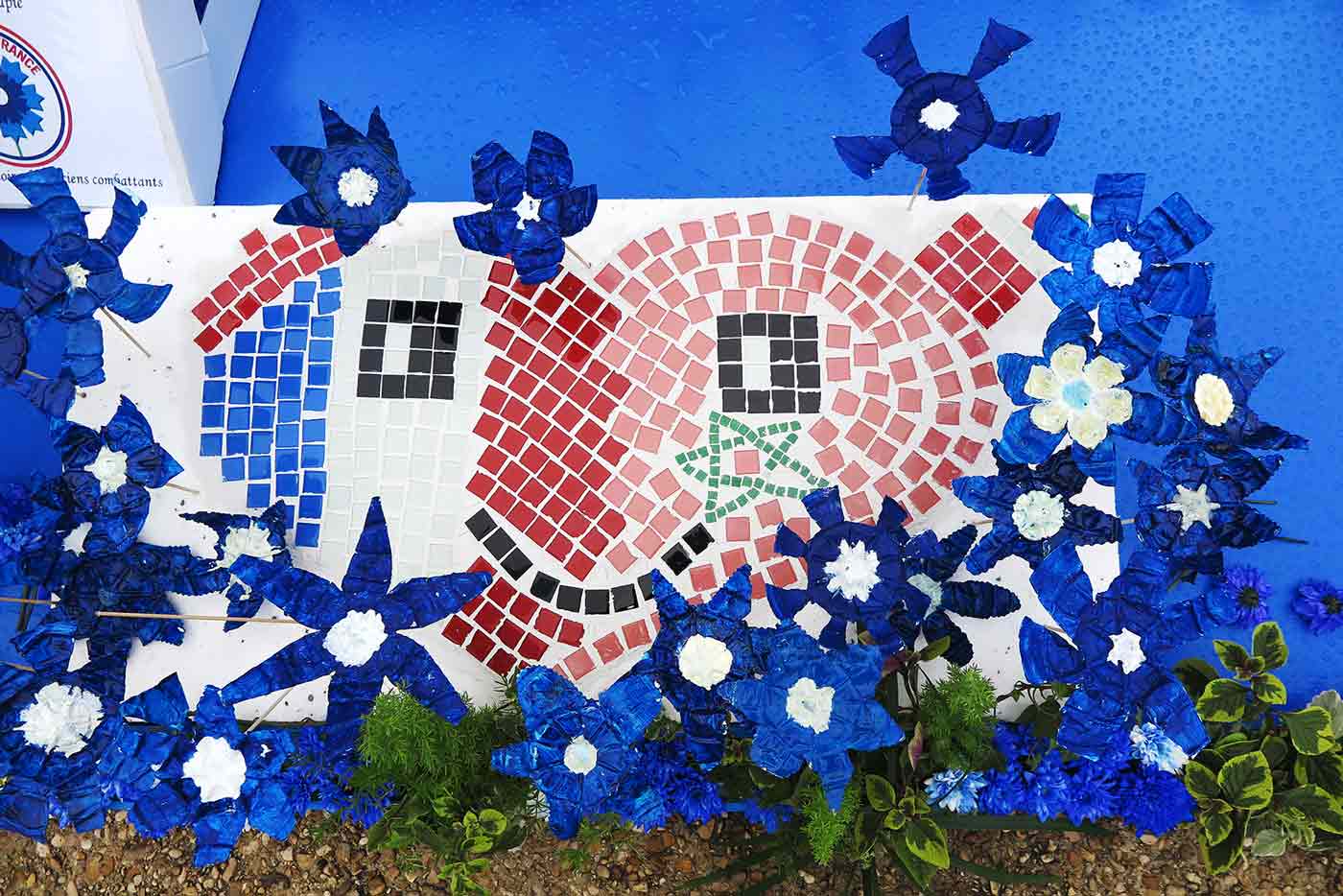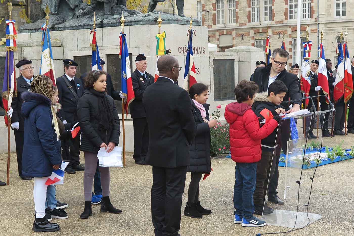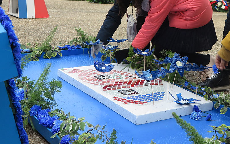 Dépôt de bleuets sur la stèle des écoles