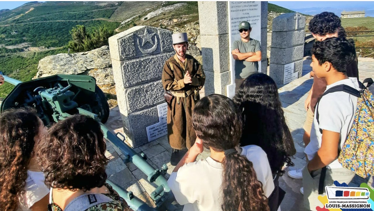 Le Lycée Français International Louis-Massignon a eu l’honneur d’envoyer une délégation composée de 13 élèves de 2nde en Corse du 27 au 30 septembre 2023 pour participer aux solennités marquant le 80e anniversaire de la Libération de la Corse, suite à une invitation du Président de la République Française. Ce voyage, orchestré en collaboration avec les services de l’ONaCVG du Maroc et de Haute Corse, représente la concrétisation d’un projet commémoratif dédié à la Libération du premier département français en 1943 par les goumiers marocains, projet qui a été initié par l’ONaCVG. Les travaux des élèves de Mme Abdelwahed, professeure d’histoire-géographie au LFI Louis-Massignon, et de Mme Pinon, professeure d’histoire-géographie au collège Montesoro de Bastia, ont été sélectionnés pour être présentés devant le Président de la République Emmanuel Macron.